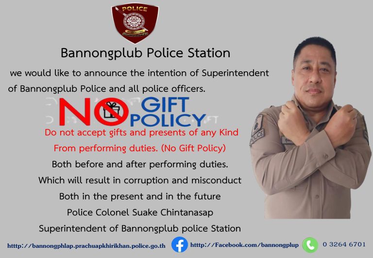 - ประกาศสำนักงานยุทธศาสตร์ตำรวจเรื่องเจตนารมณ์ที่จะไม่รับของขวัญหรือของกำนัลทุกชนิดจากการปฏิบัติหน้าที่